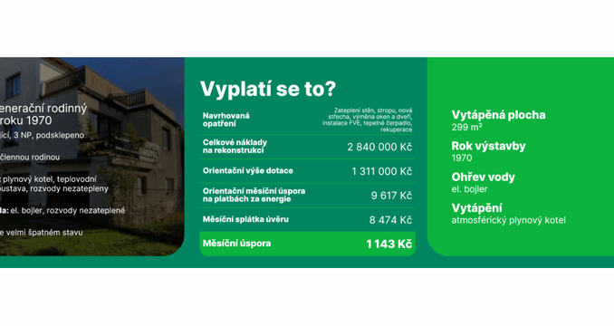 Ano, i rozsáhlá rekonstrukce staršího domu může dávat ekonomický smysl. „V modelovém příkladu dvougeneračního domu z roku 1970 se díky kombinaci zateplení, výměny oken, nové střechy, rekuperaci a instalaci tepelného čerpadla a fotovoltaiky snížily měsíční náklady na energie o 9617 Kč. I po odečtení splátky úvěru zůstává domácnosti každý měsíc více než tisícikorunová úspora. Kromě nižších nákladů na provoz získáte zdravější vnitřní prostředí, vyšší komfort a hodnotnější nemovitost,“ vysvětluje Milan Pospíšil.